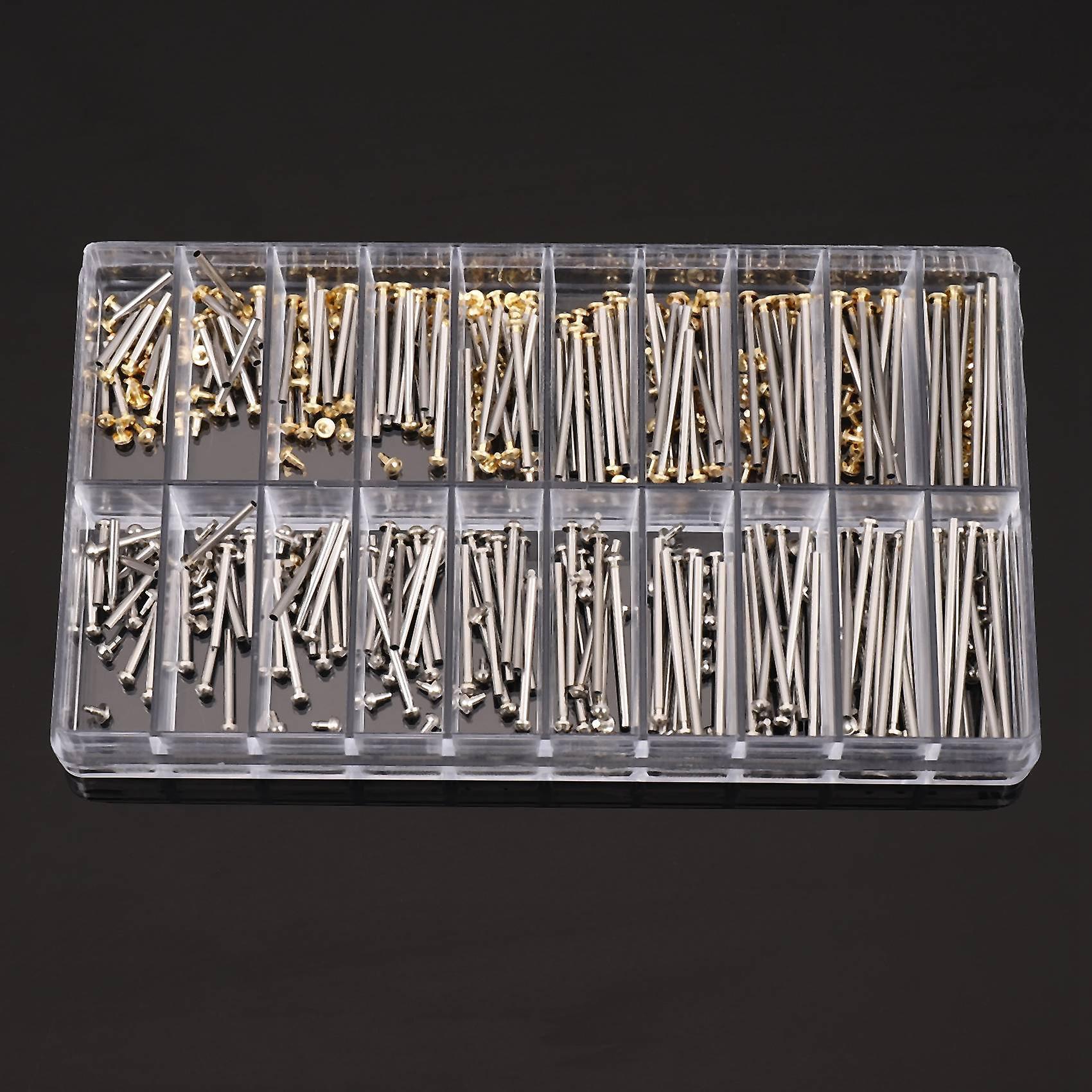 Material: it is solid and high hardness,durable;Set of 10 different sizes from 10mm-28mm watch band screw pin ,completely and Conveniently;These friction pins are designed to fasten the watch band, help you change watch straps and watch buckles without damaging your watch secondly;It is your effective helper when you repair your watch straps or other watch accessories replacement that you need;The necessary tools for watchmakers and watch enthusiast or people who want to repair his watch by himself;Type: ToolsFeature: Watch Strap ScrewsItem Type: Repair Tools and KitsThe thickness of the shaft: 1.3mmThe thickness of the cap: 0.8mmSize: 10mm-28mm (length of shaft, no cap included)Color: Silver and goldMaterial: metalPackage Contents:1 * Box Watch Strap ScrewsOnly the above package content, other products are not included.Note: Light shooting and different displays may cause the color of the item in the picture a little different from the real thing. The measurement allowed error is +/- 1-3cm.
