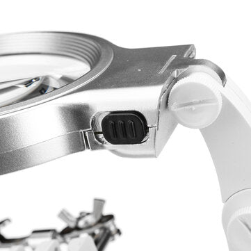 Features:? - Multi Purpose: Our helping hands magnifying glass with LED light can be used as a magnifier and a desk lamp, application range for soldering, building models, electronics repair, DIY projects, electronic welding, reading, stitching, sewing, biological observation etc. - Magnifying Lens: 3X Illuminated Helping Hand Magnifying Glass Station with 4.5X Auxiliary Lens. - Adjustable Arms: 360? ̄ rotating neck and bendable arms allows you to adjust the lens to the position where you need it the most. - Adjustable Clamp: 2 fully adjustable helping hands with clamp and crocodile clips, iron holder, and tray. - LED Lighted: With 10 super bright LED lights. Work very well in the dark environment.? ? Specifications:? Color: White? Material: ABS + Metal + Acrylic Lens? Magnification: 3X(Main Lens) /4.5X(Auxiliary Lens)? Dia. of Lens: Approx. 75mm/20mm? Illumination: 10pcs LED? Power Supply: 3 * AAA 1.5V Batteries(NOT Included) or USB DC5V(Included) ? Package List:? 1 x Soldering Iron Magnifier 1 x USB Cable