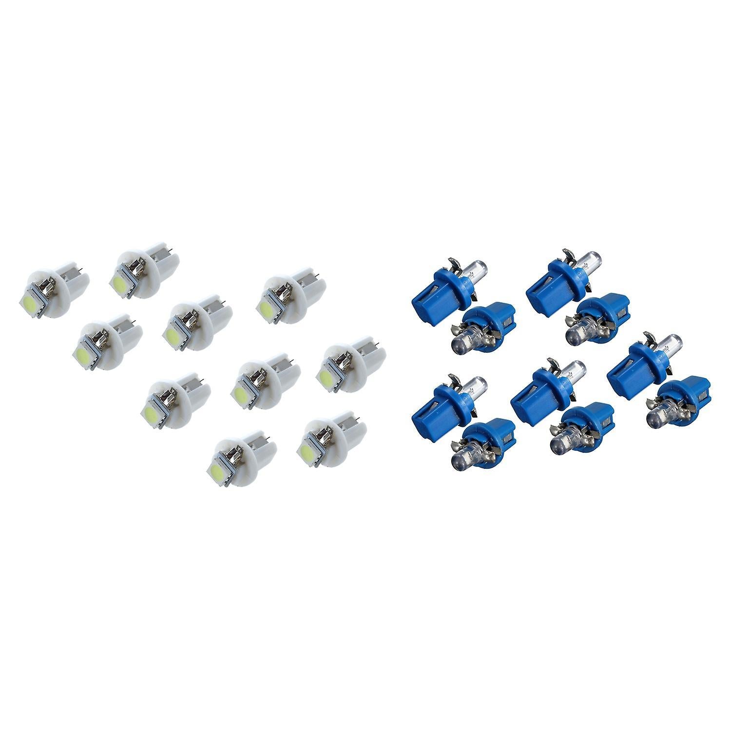 20 x Car light: 10*a + 10*bEnergy saving, low power consumption, long lifePlug & Play installation, easy to installReplacement indicator and speedometer illumination etc.Light color: white/BlueDimensions (W x D): approx. 0.7 x 0.4 inch / 1.8 x 1.0 cmCompatible with T5 B8.5D and etc.LEDs: 1 SMD LEDs (5050 Chip)Voltage: DC 12VMaterial: ABS resin, lamp beads/ABS, Straw Hat LED Lamp BeadsT5 LED car replacementLonger life timeApplications: Ctss / indicators / dashboard lights dashboard lightsConnector: T5 / LED replacement B8 - 5D carPackage include: 20 x Car lightOnly the above package content, other products are not included.Note: Light shooting and different displays may cause the color of the item in the picture a little different from the real thing. The measurement allowed error is +/- 1-3cm.