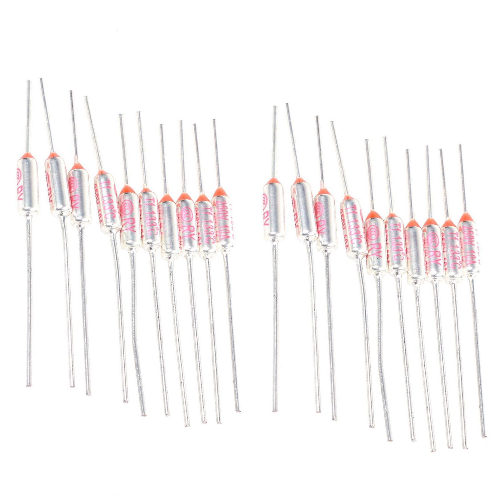 Product Name: Thermal FuseModel: RY TFTotal Length: 65mmRated Operating Temperature: 133 CelsiusRated Voltage: AC250VRated Current: 10AWeight: 11g/setMaterial: MetalColor: red, silverPackage Contents: 20 x Thermal FuseOnly the above package content, other products are not included.Note: Light shooting and different displays may cause the color of the item in the picture a little different from the real thing. The measurement allowed error is +/- 1-3cm.