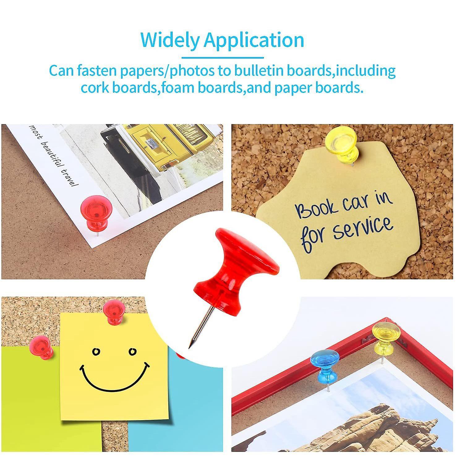 You will get 100pcs push pins, assortment of colors for eye-catching appeal, each size is 1inch in length x 0.6inch in width, which is convenient for you to carry them to anywhere you want, and also can be stored in desk or backpack expediently.Material: The heads of giant push pins are made of plastic texture, the needle points are made of metal, hard and indurative. Which are not bent or damaged easily.Our large thumb tacks can be used in many ways. You can pin papers, notes, map, photos, poster, memos, calendar schedule and DIY projects, etc to cork boards, bulletin boards.These large plastic heading pins allow you to easily nail your supplies, and your hands won' t be hurt for the plastic head is convenient to hold.hese colorful push pins can be used in a variety of scenes, such as classroom, office, workplace, home or kitchen, beautiful colors make them as good decorations.Size: 1 x 0.6inchesColor: transparent white, red, yellow, blue, greenMaterial: Plastic + MetalPackage Contents: 100 Pcs Push PinsOnly the above package content, other products are not included.Note: Light shooting and different displays may cause the color of the item in the picture a little different from the real thing. The measurement allowed error is +/- 1-3cm.