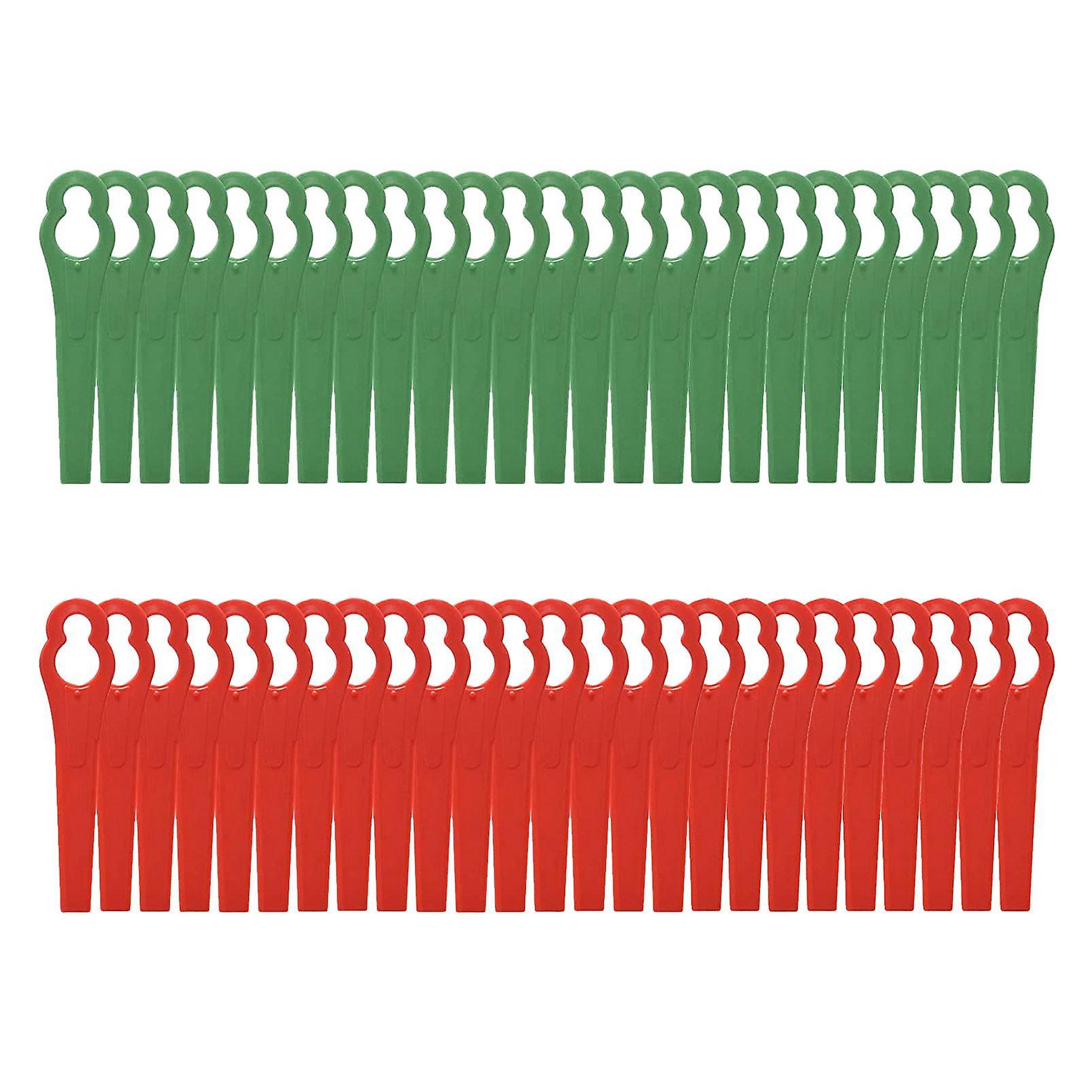 1. Replacement Blades: Plastic lawn mower blades are the perfect replacement for garden peelers, trimmers and lawn mowers.2. Product Parameter: Length: 83mm, large circle diameter: 12mm, small circle diameter: 7mm.3. Easy to Install: You can install the blades without any other tools,and it is safe and convenient.4. Wide Compatibility: Suitable for bosch art23 li accutrim easytrim accu gtech st 04 & st 05 strimmer / trimmer qualcast mown trim easi-lite 28, 30 homebase st05 sovereign st05.Colour: red + greenMaterial: plasticPackage Contents:50 x Trimmer Blades (Red)50 x Trimmer Blades (Green)Only the above package content, other products are not included.Note: Light shooting and different displays may cause the color of the item in the picture a little different from the real thing. The measurement allowed error is +/- 1-3cm.