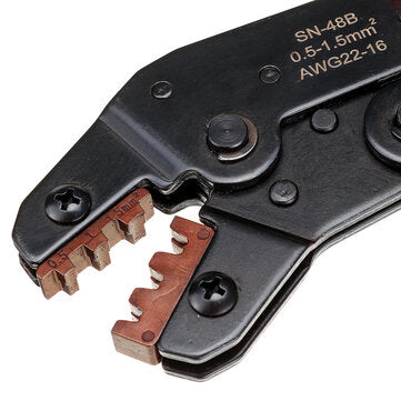 Feature: - This heavy duty wire crimping tool has a ratcheting mechanism design, you can take less strength to make a good crimp. - This ferrule wire crimper kit comes with wire connectors and a ratcheting crimper.? - The crimping size is AWG22-16(0.5-1.5mm2). - The crimping end is removable, and there are two screws on it, you can take a replacement of the dies for different types of crimp on ends.