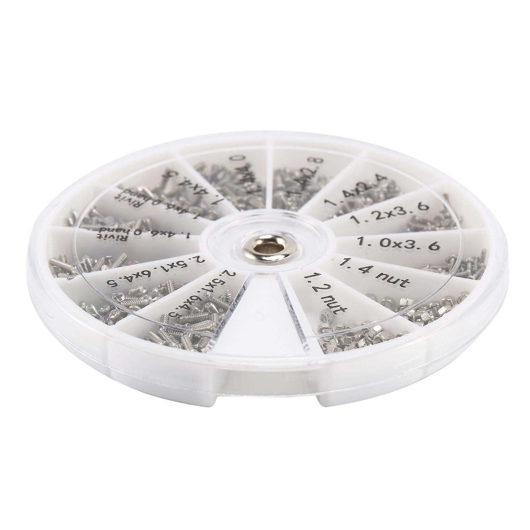 1000pcs stainless steel screws & nut setBrand new and high quality.Can be used for spectacle's and watches.Prefect for glasses,watches,electronics or anything else that requiressmall screws.The assortment contain the following sizes:M1.2 nut(100pcs)M1.4 nut(100pcs)M1x3.6(100pcs)M1.2x3.6(100pcs)M1.4x2.4(100pcs)M1.4x2.8(100pcs)M1.4x4(100pcs)M1.4x4.5(100pcs)M1.4x6 Rivit head(100pcs)M1.6x4.5(100pcs)Package Contents:1 X 1000pcs stainless steel screws & nut setOnly the above package content, other products are not included.Note: Light shooting and different displays may cause the color of the item in the picture a little different from the real thing. The measurement allowed error is +/- 1-3cm.