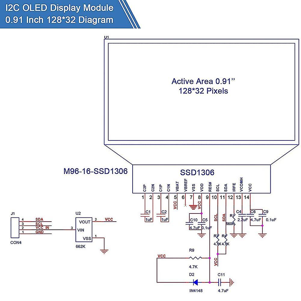 What you will get: you will get 2 OLED display modules with classic display colors, self illumination with no need of backlightPower-saving display: the I2C OLED display performs better than the traditional LCD display and with lower consumption the IIC (I2C communications) simplifies connections; Please note that these I2C OLED display module comes without pin headersMore details: this I2C LCD display is compatible with for Arduino, ESP8266, ESP32, STM32, etc.Good compatibility: this I2C OLED display module is compatible with Raspberry Pi 4B/ 3B+/ 3B/ 2B/ Zero, compatible with for Arduino, also compatible with ESP8266, ESP32, STM32, etc.Specifications:Driver IC: SSD1306Size: 0.91 inch OLEDResolution: 128 x 32Interface type: IIC interfaceDisplay color: bluePin description:GND: power groundVCC: Power + (DC 3.3 - 5V)Operating temperature: -40 - 85 degree CelsiusSCL: clock lineSDA: data lineColour: blueMaterial: plastic Size: 38 x 12mmPackage Contents:2 x I2C SSD1306 OLED display modulesOnly the above package content, other products are not included.Note: Light shooting and different displays may cause the color of the item in the picture a little different from the real thing. The measurement allowed error is +/- 1-3cm.