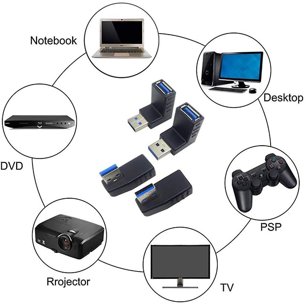 They connect your USB devices without losing speed with the fast 3.0 connection.4-Pack 90-degree Right and Left,Up and Down angle USB head extension, Combines the USB 3.0 male or female cables into a single, longer cable.This USB 3.0 vertical angled extension head takes full advantage of USB devices if space is an issue.Supports data transfer rates of up to 5Gb/s and is backward compatible with USB 2.0/1.1.Advantages: adopts plastic, alloy and brass as raw material, containing copper plug, membrane, copper foil and outer mold,which ensures that transmission effect will not be disturbed or weaken due to adapter.USB 3.0 A male connector can be connected to the USB connector and other USB devices,such as a motherboard or PC card.USB 3.0 B male connector can be connected to the USB connector and other USB devices, such as a printer or hard disk box.USB 3.0 Mini A male connector can be connected to the USB connector and other USB devices,such as: OTG host-side devicesand hard disk boxes, mobile phones ,etc.colour:blackMaterial:plastic + metalPackage Contents:1x USB 3.0 Left Angle Adapter Plug Converter1x USB 3.0 Right Angle Adapter Plug Converter1x USB 3.0 Up Angle Adapter Plug Converter1x USB 3.0 Down Angle Adapter Plug ConverterOnly the above package content, other products are not included.Note: Light shooting and different displays may cause the color of the item in the picture a little different from the real thing. The measurement allowed error is +/- 1-3cm.