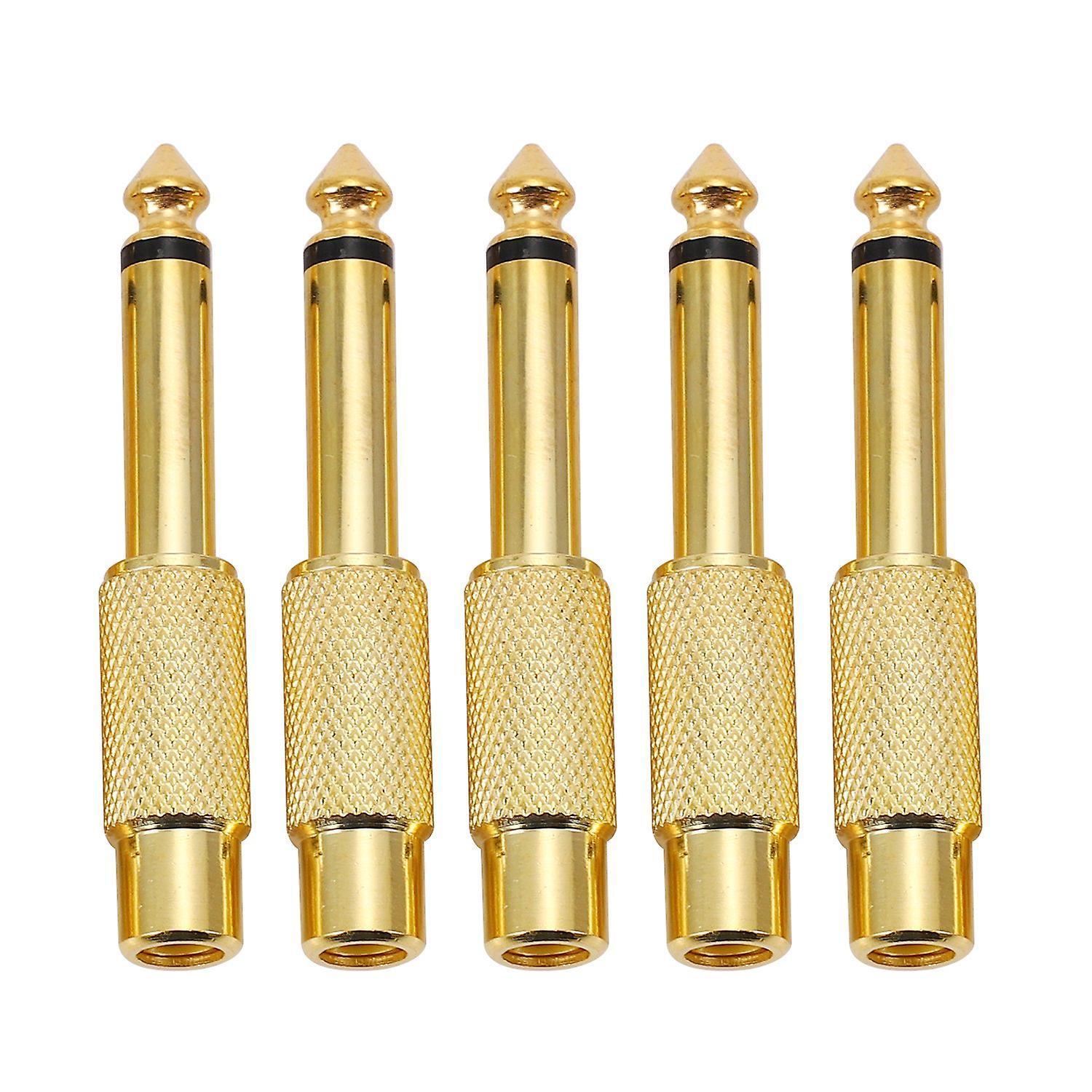 6.35mm 1/4 inch Male Mono Plug to RCA Female Jack ConnectorGreat for speaker use for mono channel microphone connecting.Widely used in home, KTV, or other places where use the audio devices.You can create a RCA socket by insert the 6.35mm mono plug to a 6.35 socket easily.Color: goldmaterial: metalPackage Contents: 5*6.5mm to RCA Audio AdapterOnly the above package content, other products are not included.Note: Light shooting and different displays may cause the color of the item in the picture a little different from the real thing. The measurement allowed error is +/- 1-3cm.